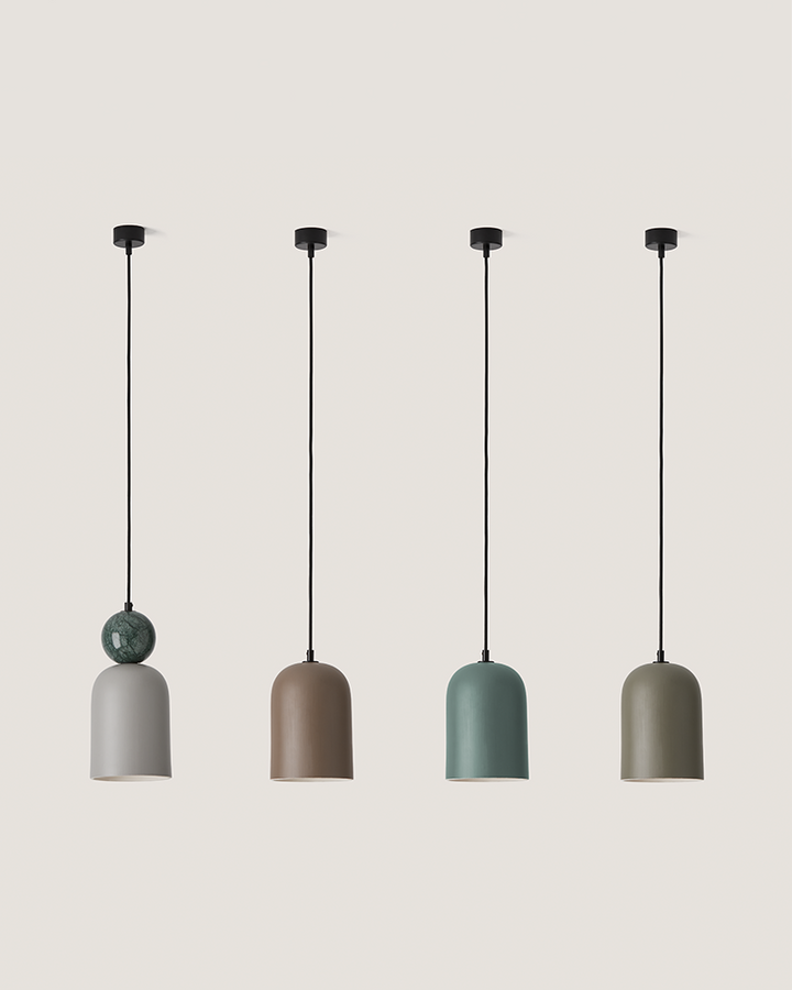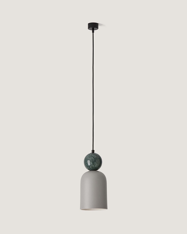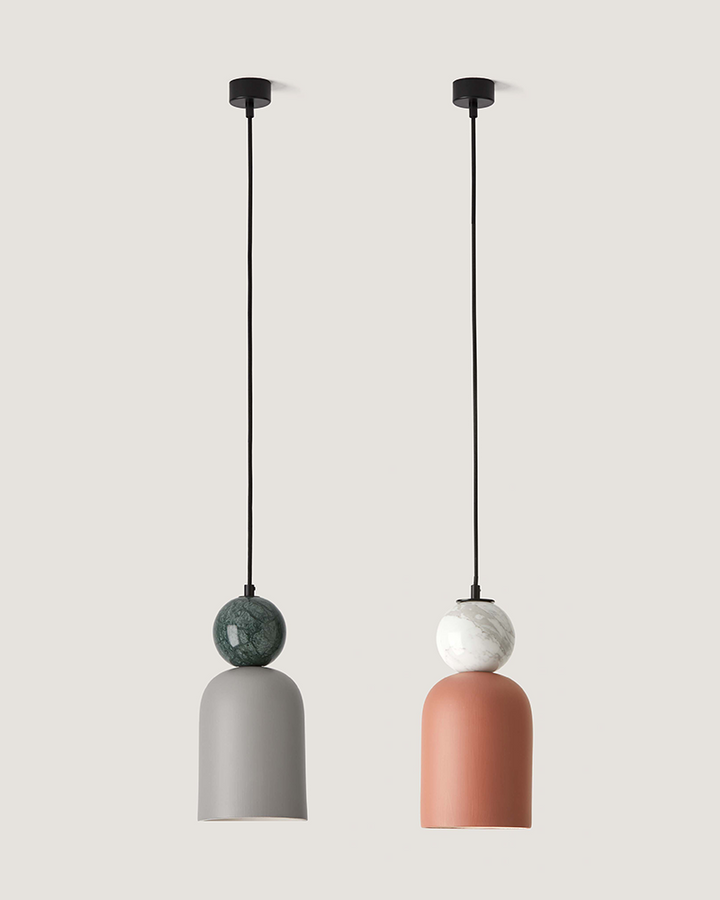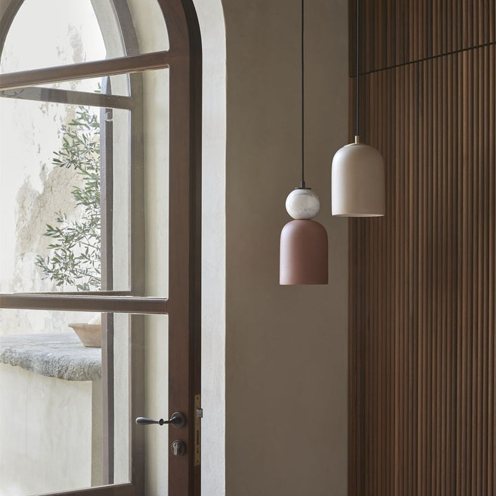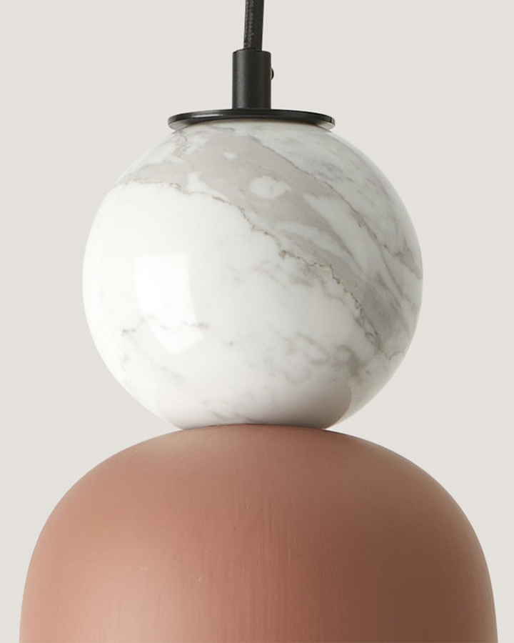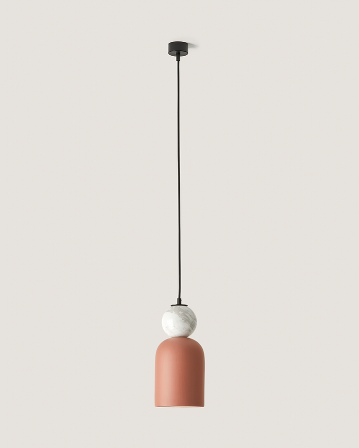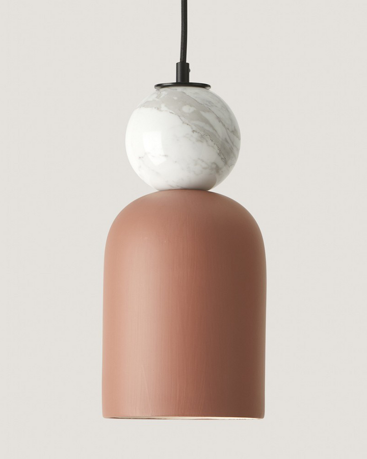 Ceiling lamp with ceramic lampshade Bell. Combination of a spherical piece of white marble with a terracotta-coloured ceramic lampshade. Designer pendant lamp for decorative lighting in the home. The ceramic is hand-painted, allowing it to be customised between various finishes. Bell Pendant Light was designed by Pepe Fornas. Bell features a marble ornament which sits above a ceramic dome shade resulting in a minimal and clean aesthetic.